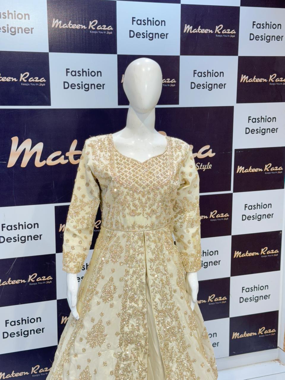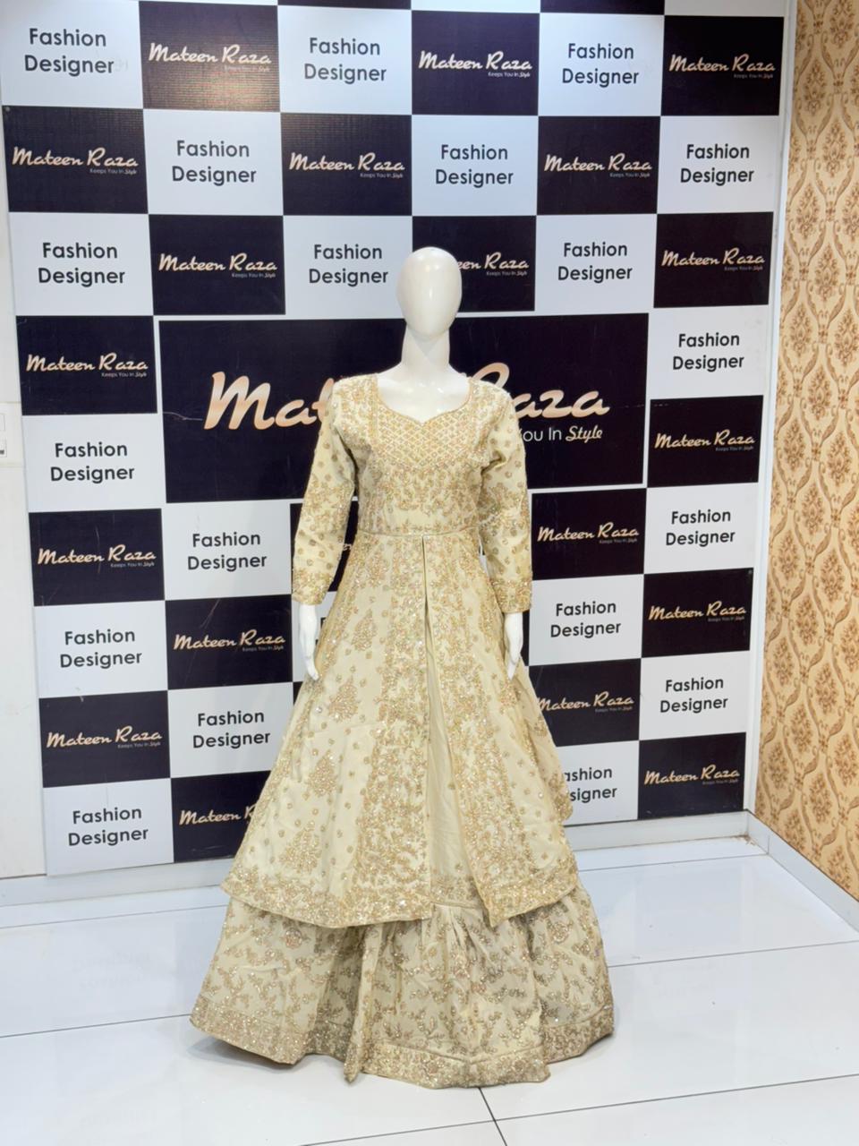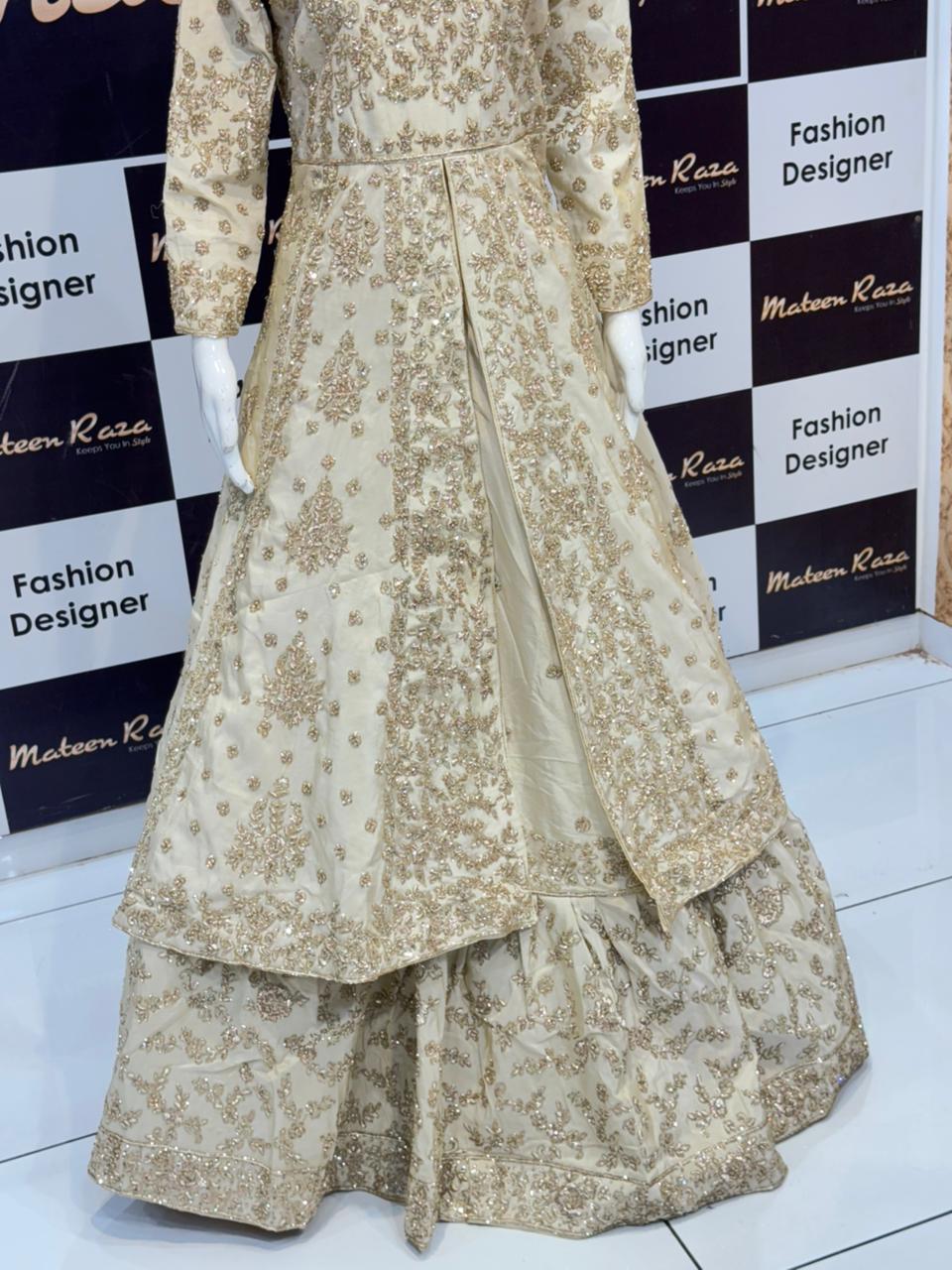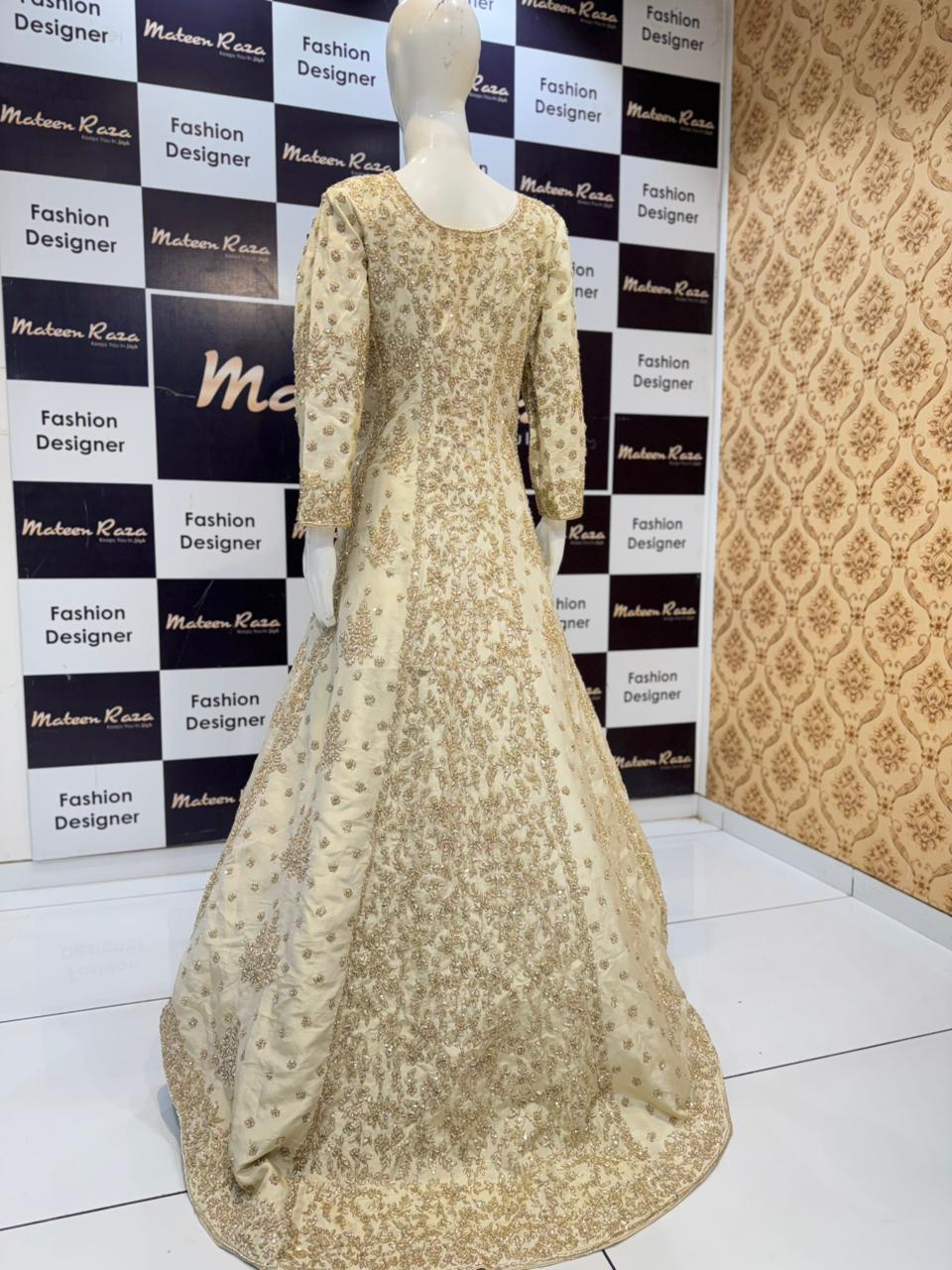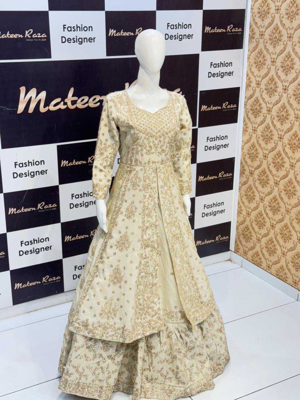 Shop the exquisite cream/gold bridal gown featuring detailed handcrafted Zardozi embroidery. Perfect for wedding receptions and grand occasions. Discover timeless elegance and luxury.